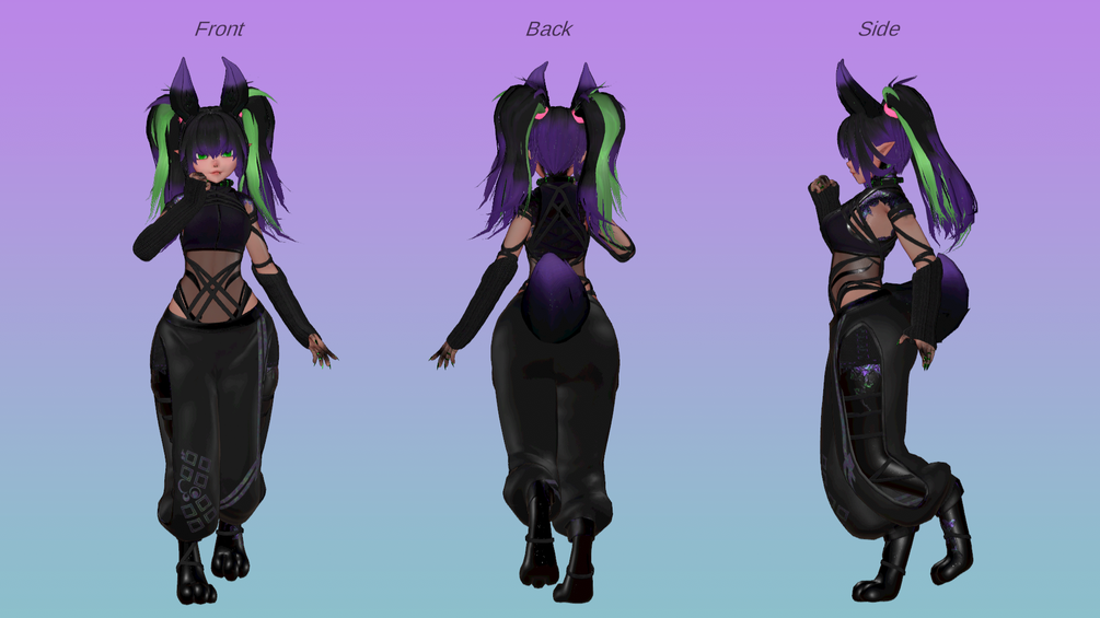 sleeves, bodysuit, kimono, arm warmers, pants, shorts, tank top, ears, tail, arm and leg straps, harness, collar, long hair, buns , pigtails